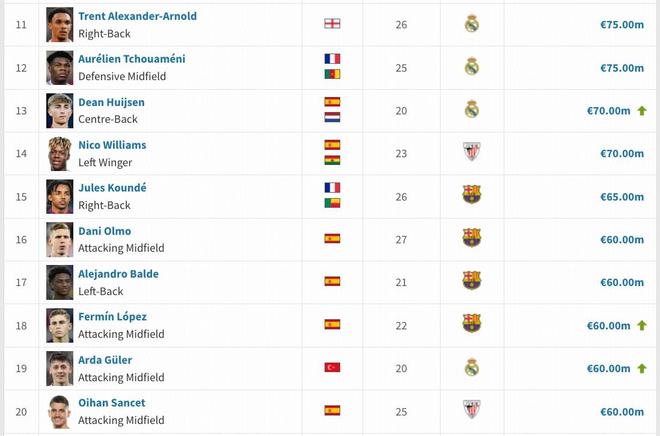 德国转会市场公布最新一期身价,西甲成为五大联赛中首个更新的联赛。前三名亚马尔、姆巴佩、贝林厄姆身价维持不变,维尼修斯身价下跌2000万欧,来到1.5亿欧。