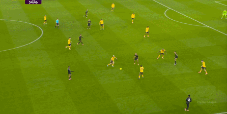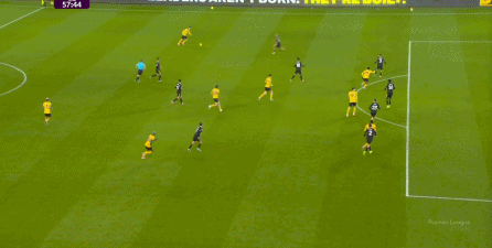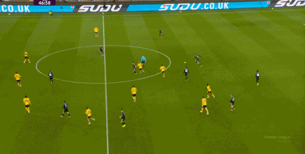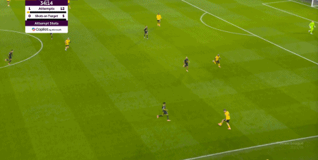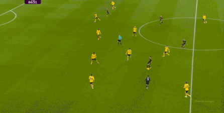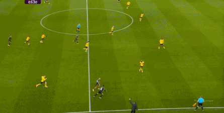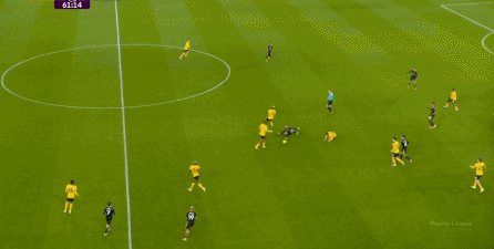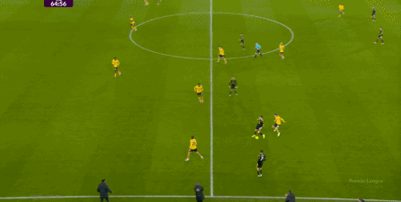 布鲁诺没有进球,但马兹拉维及时前插,回收球权的同时拉开宽度,为布鲁诺从右肋起脚制造空间,于此同时,芒特展现了自己作为战术球员的特点,做出了一次很好的跑位,从而打进了第三球: